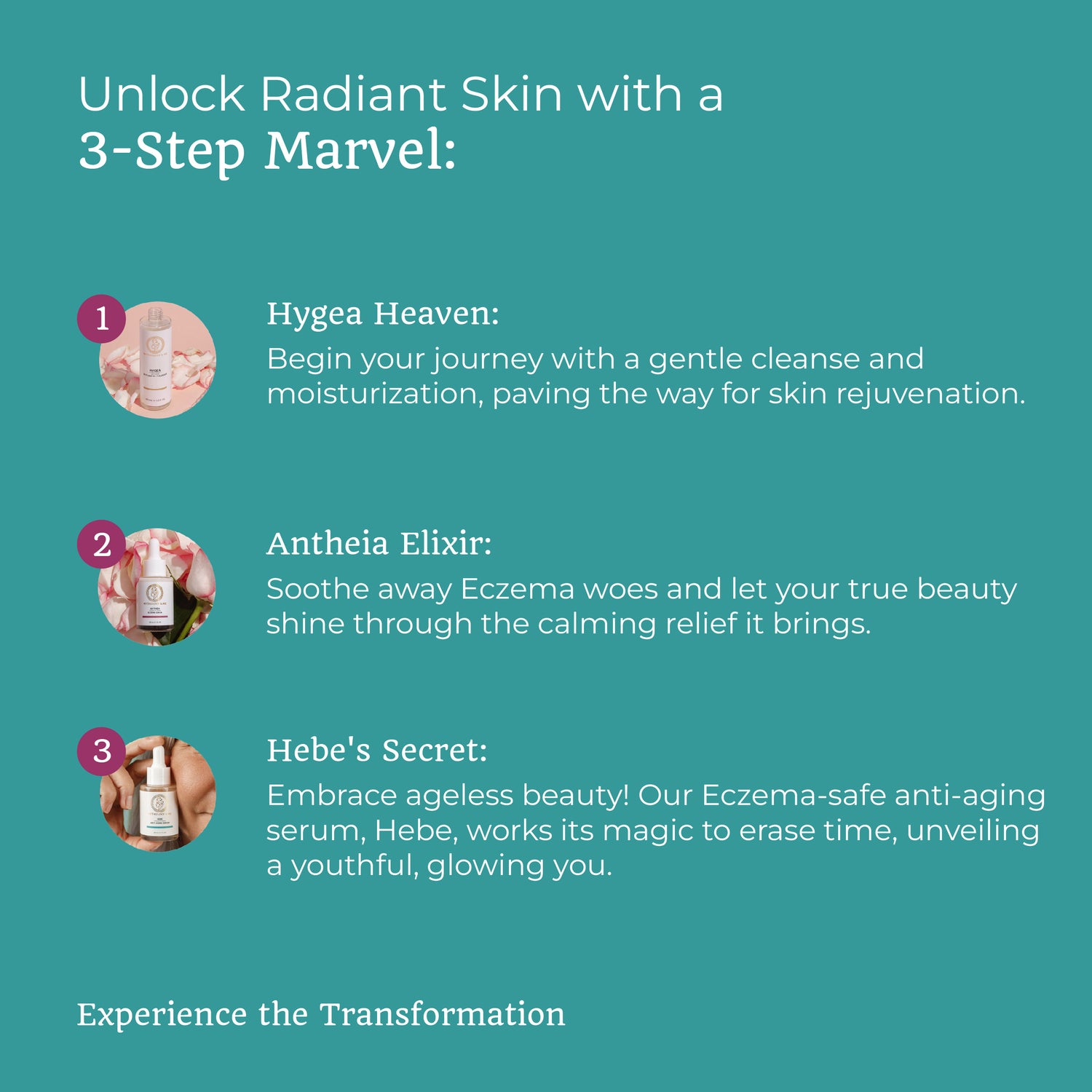 Transform your skin - Replenish, revive, and heal even the most delicate skin. Begin your ritual with Hygea Botanical Cleanser, gently cleansing and soothing your skin. Next, let Antheia Eczema Serum work its magic, whisking away troublesome eczema symptoms. Lastly, the divine Hebe Anti-Aging Serum swoops in to erase the hands of time, leaving you with age-defying radiance. Glow like a deity at every stage of your life. Embrace the Mythology & Me experience today!